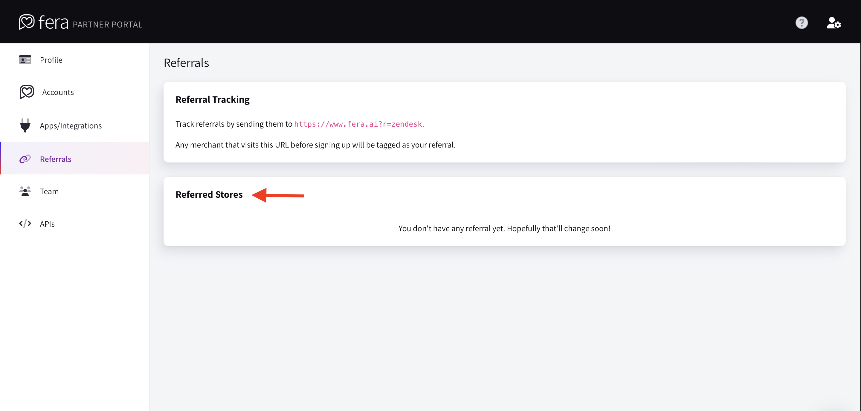 In Referrals page, you can track all the stores that installed Fera app referred by you (if you have any).